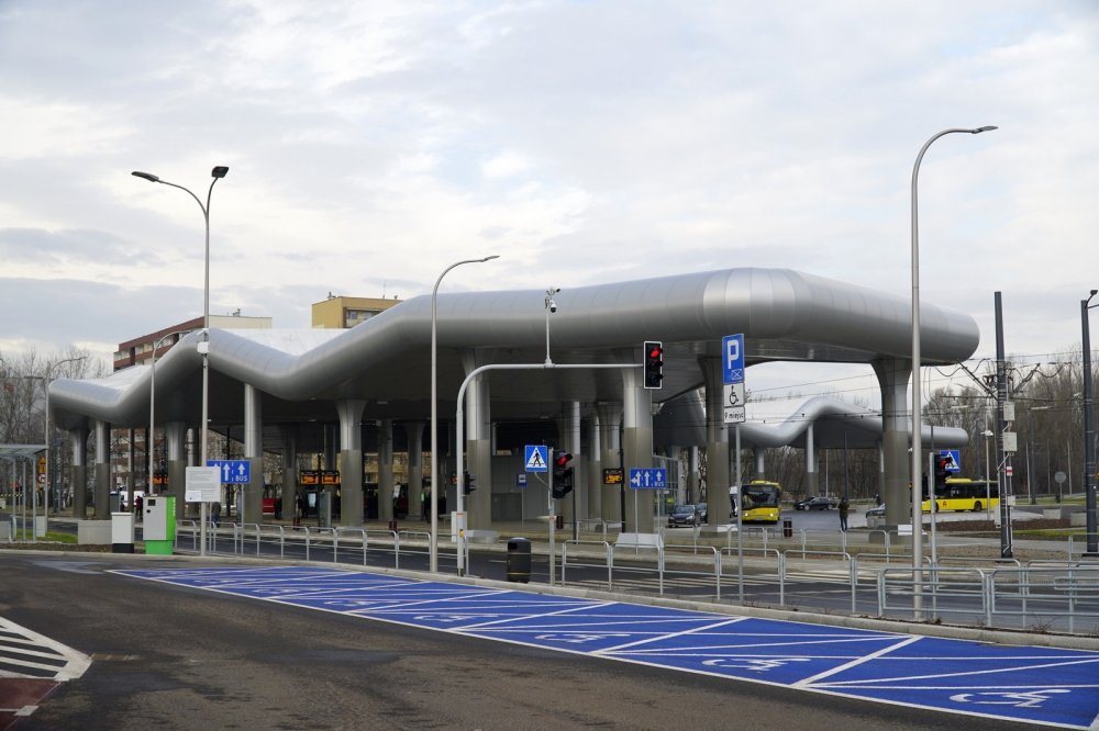 A modern transport hub in Katowice that streamlines transfers between trams, buses, and personal vehicles.